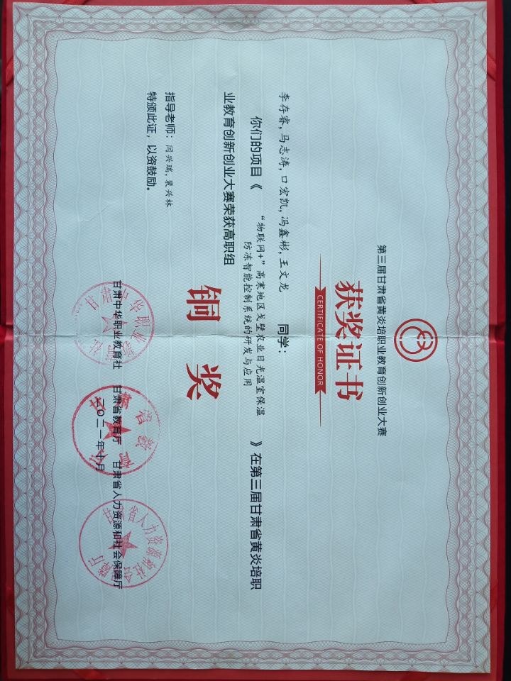 第三届甘肃省黄炎培职业教育创新创业大赛(三等奖)