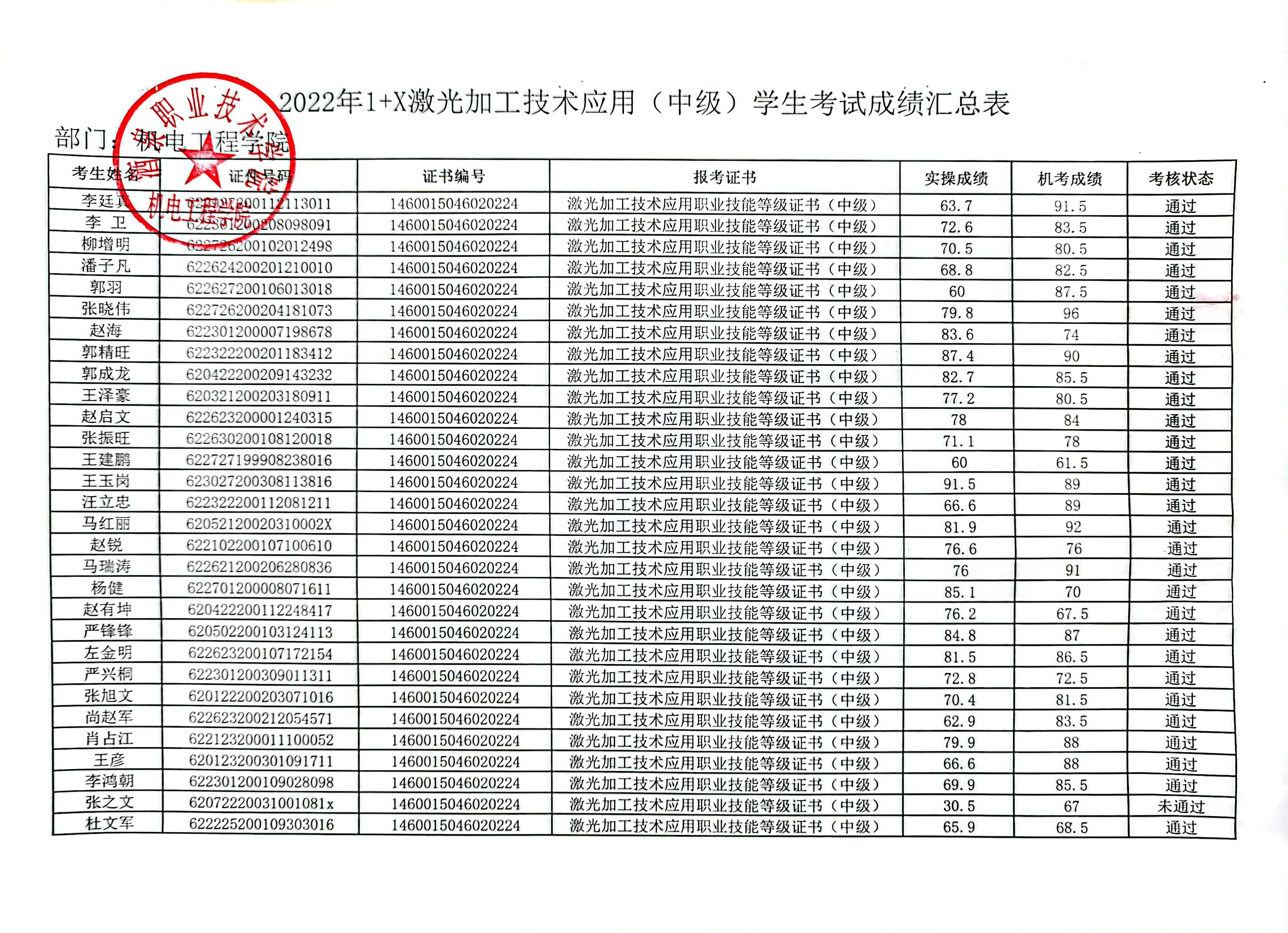 附件1:2022年1+X激光加工技术应用(中级)学生考试成绩汇总表